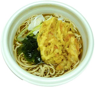 レンジ専用のコシのある食感のそば。醤油・本みりんにかつおのだし、かつお粉末を加えただし感のあるつゆと玉ねぎ・人参・青葱・小海老を使用した野菜かき揚げを盛り付けました。