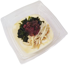 豆腐にごま油で和えたネギ、蒸し鶏、たまねぎスライス、人参、きゅうり、こんぶぽん酢を合わせました。夏向けのさっぱりした仕立ての商品です。